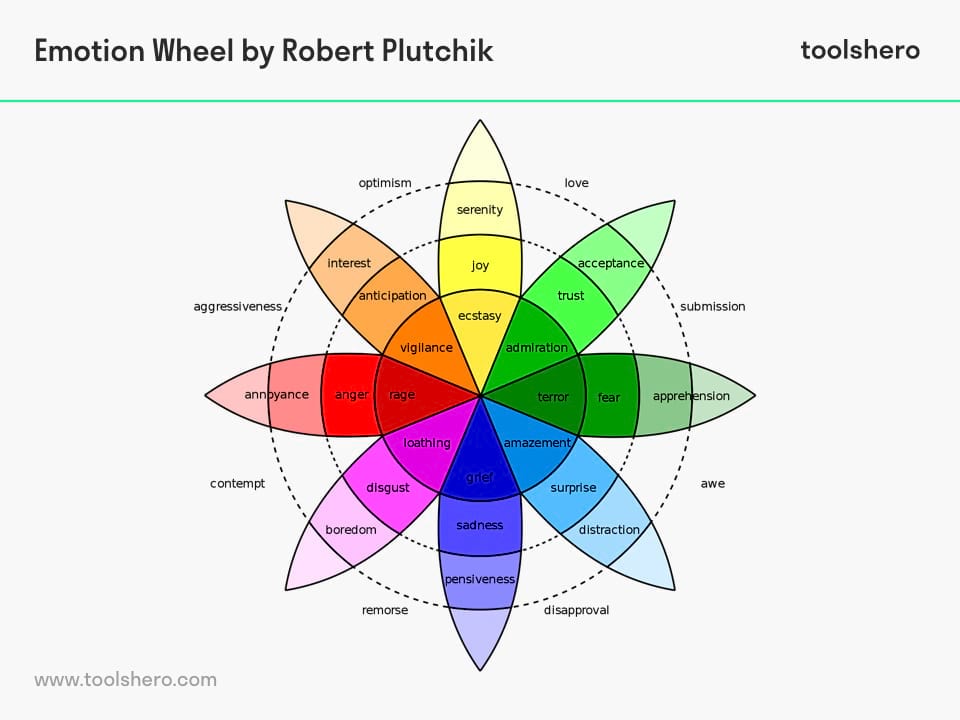 - Secondary Dyads (emotions one step apart – common but slightly less intense)